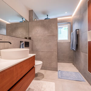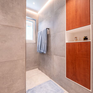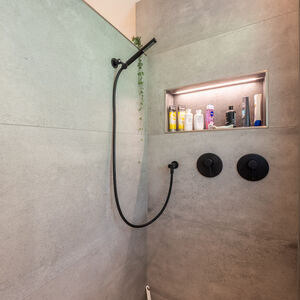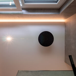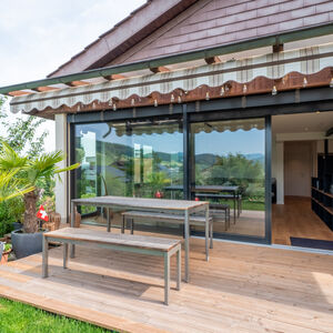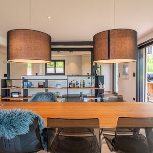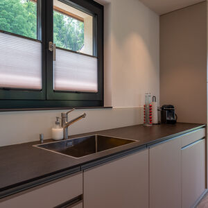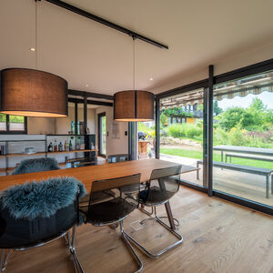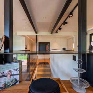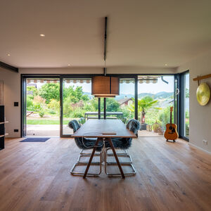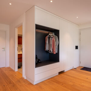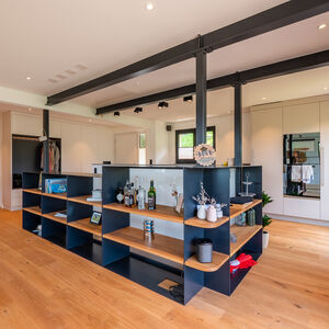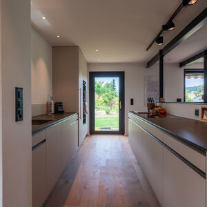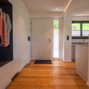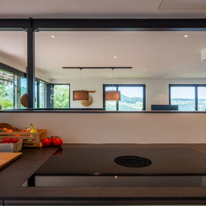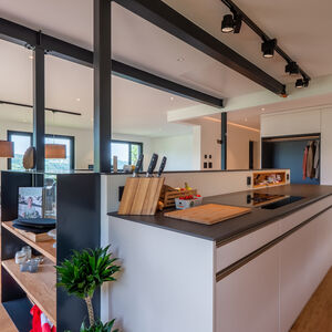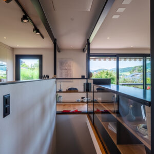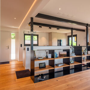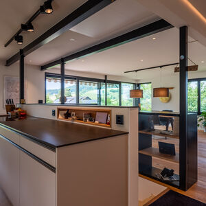 Umbau von Einfamilienhaus mit Öffnung und Zusammenlegung der Küche, Ess- und Wohnzimmer. Absturzsicherung bei Kellertreppe durch ein Holz-Metallregal. Vergrössern der Fensterfront und Umgestaltung der Dusche.