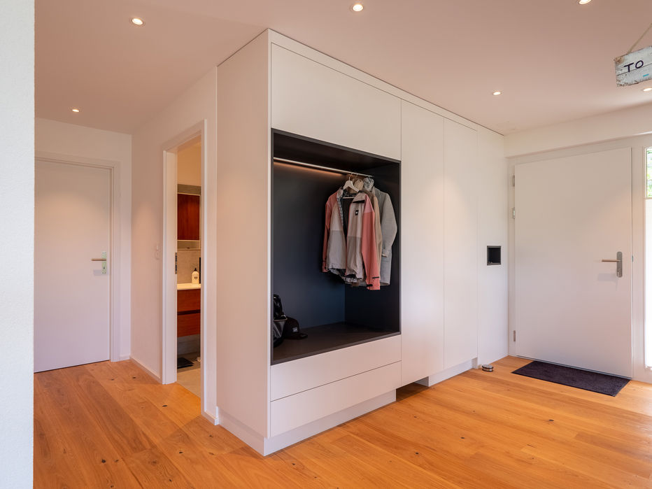 Eine umfassende Sanierung verwandelt das Objekt in einen modernen, klar strukturierten Wohnraum. Die neue, sehr moderne Küche und die begehbare Dusche setzen funktionale wie ästhetische Akzente. Zahlreiche Einbauschränke und Regale schaffen Ordnung und nutzen den Raum optimal. Grosse Fensterflächen bringen viel Licht ins Innere und unterstreichen die ansprechende, sorgfältig gestaltete Innenarchitektur.